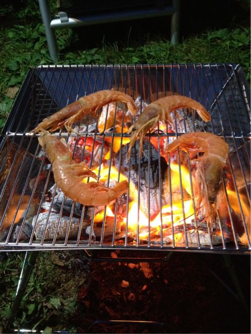 まずは、刺身用のエビを塩焼き、頭まで食べれます。最高~!
