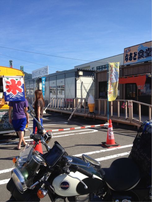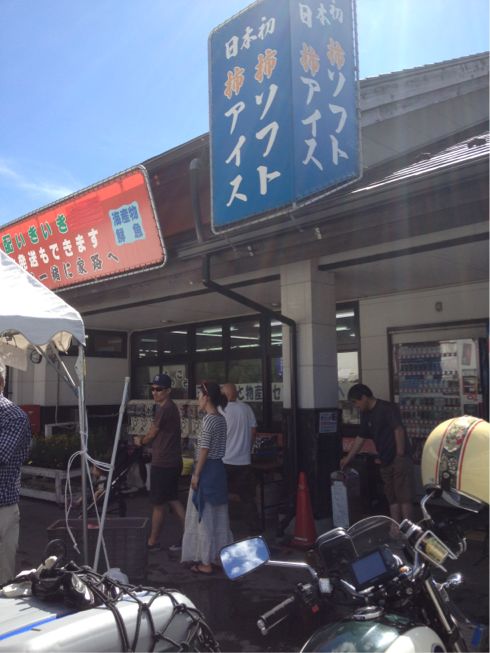 三陸に到着。看板にある日本発柿ソフト250円をいただきました。