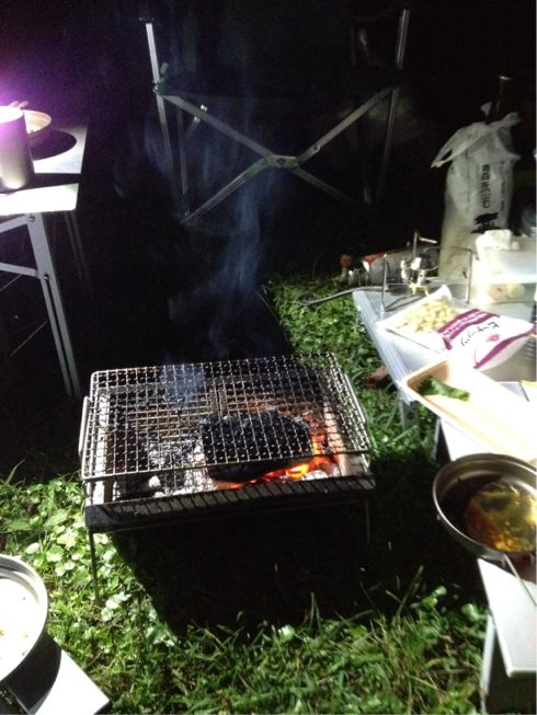 18時、キャンプ場到着。テントを張って、風呂に入り、ビールに焼き焼き、旨かった~