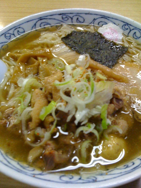 17時50分、山形県、新庄市に入り、もつラーメンまんぷくという店があったので立寄り、もつラーメン600円をいただきました。